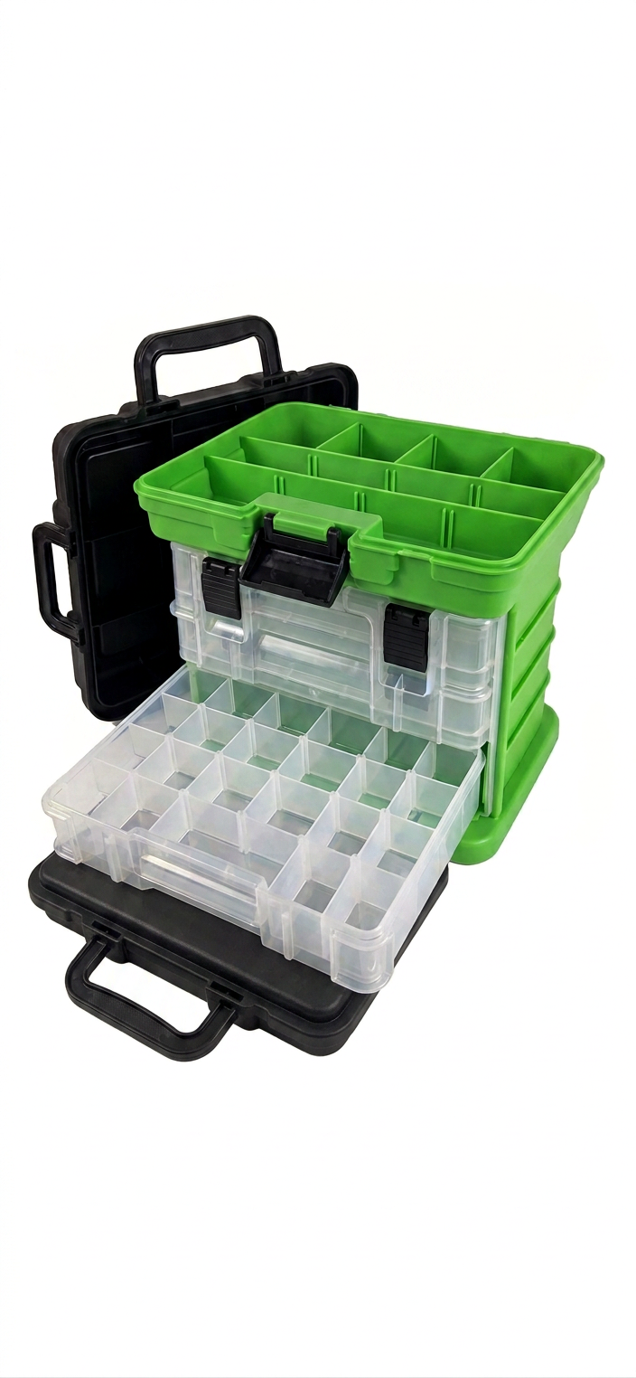 The StackSafe 4-Layer Tackle Box is our grab-and-go organizer for hard baits, terminal tackle, plastics, and tools. The photos show the exact box closed and opened up so customers can see the real storage layout before they buy.